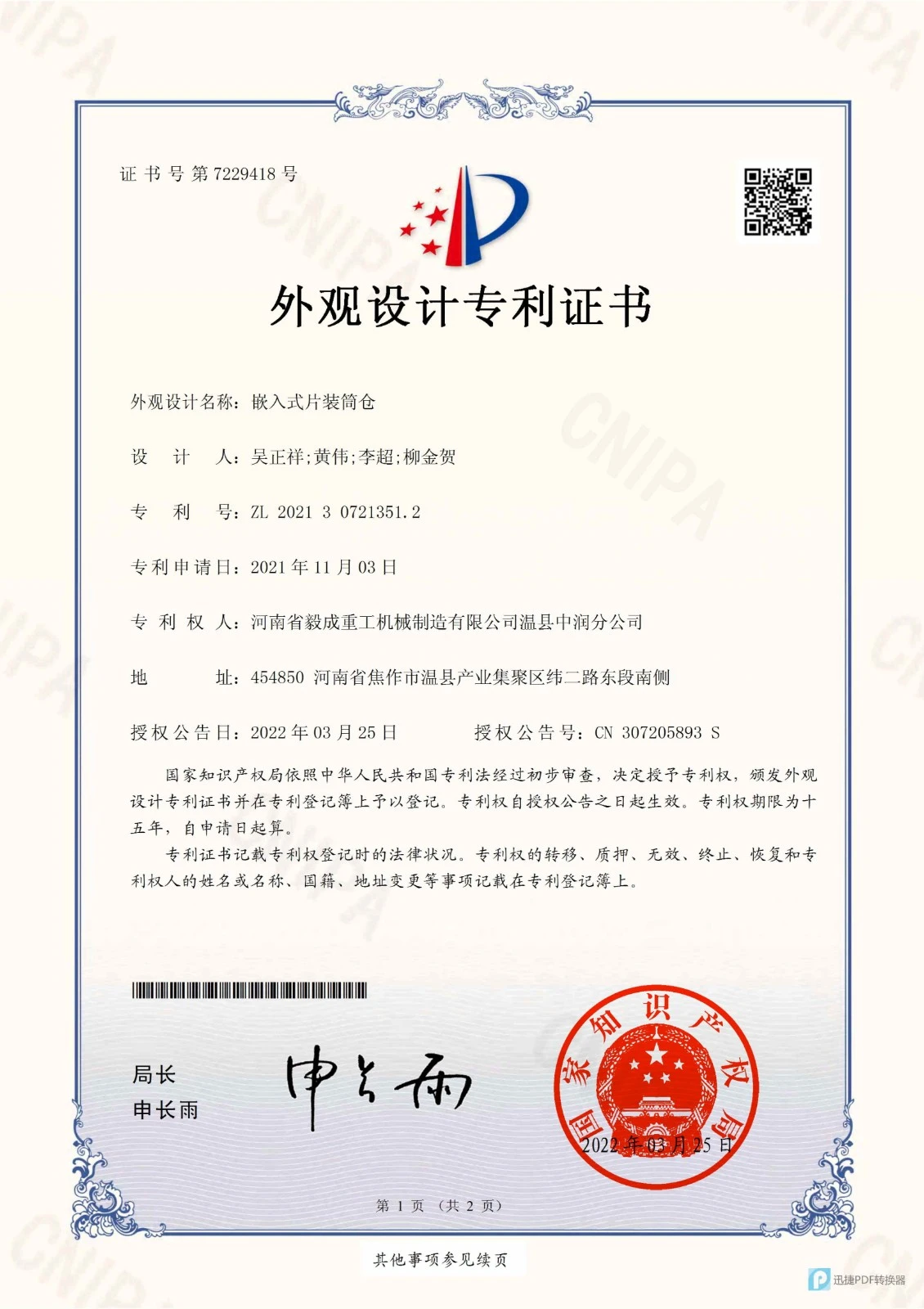 企业高度重视科技研发投入,目前有实用新型专利8项,拥有YCZG毅成重工、淼润成、中润成等商标3个。